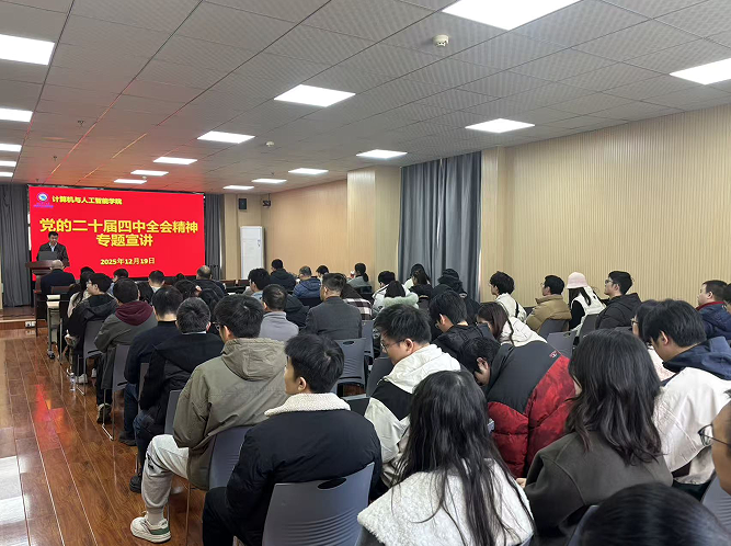 2025年12月19日下午,计算机与人工智能学院在学海楼510报告厅举行党的二十届四中全会精神专题宣讲会,邀请校党委宣讲团成员、管理学院牟仁艳教授做专题辅导报告,全体教职工党员和学生党员代表参加,宣讲会由学院党委书记陈采军主持。