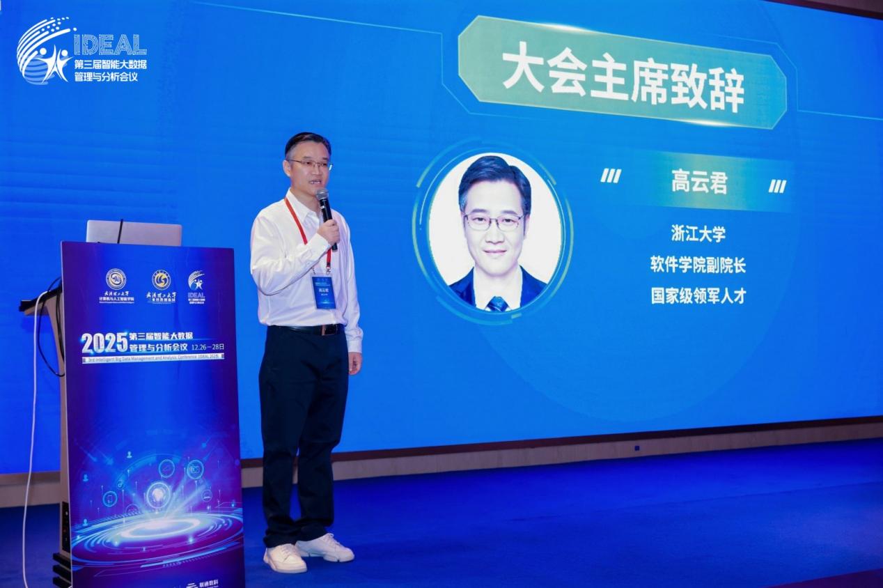 随后,本届大会主席高云君教授发表致辞。他指出,大模型时代的到来为智能大数据管理创造了前所未有的发展机遇,更彰显了该研究领域的关键作用与战略价值。高教授呼吁学界同仁乘势而上、锐意进取,共同推动领域研究实现新的突破,持续提升学术影响力与社会贡献度。
