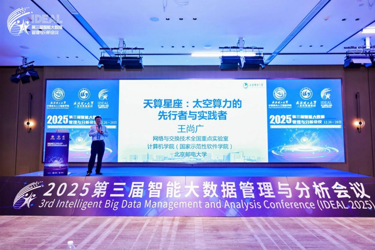接下来,北京邮电大学计算机学院院长、国家杰出青年科学基金获得者、天算星座首席科学家王尚广教授作《天算星座:太空算力的先行者与实践者》主旨报告。报告指出,随着卫星智能技术快速发展,低轨卫星正成为各界关注热点,而太空算力作为新兴研究方向已成为卫星互联网建设中最具挑战性的关键环节。王尚广教授系统介绍了北邮天算星座的建设目标、系统特点与科学价值,重点汇报了团队在卫星云原生平台、卫星大模型、卫星大数据等代表性工作进展,并分享了"卫星俩夫妻"(卫星操作系统和开源卫星平台)以及"太空三兄弟"(太空服务器、太空路由器和太空交换机)的最新研发成果,为构建天基智能计算基础设施提供了创新范式。