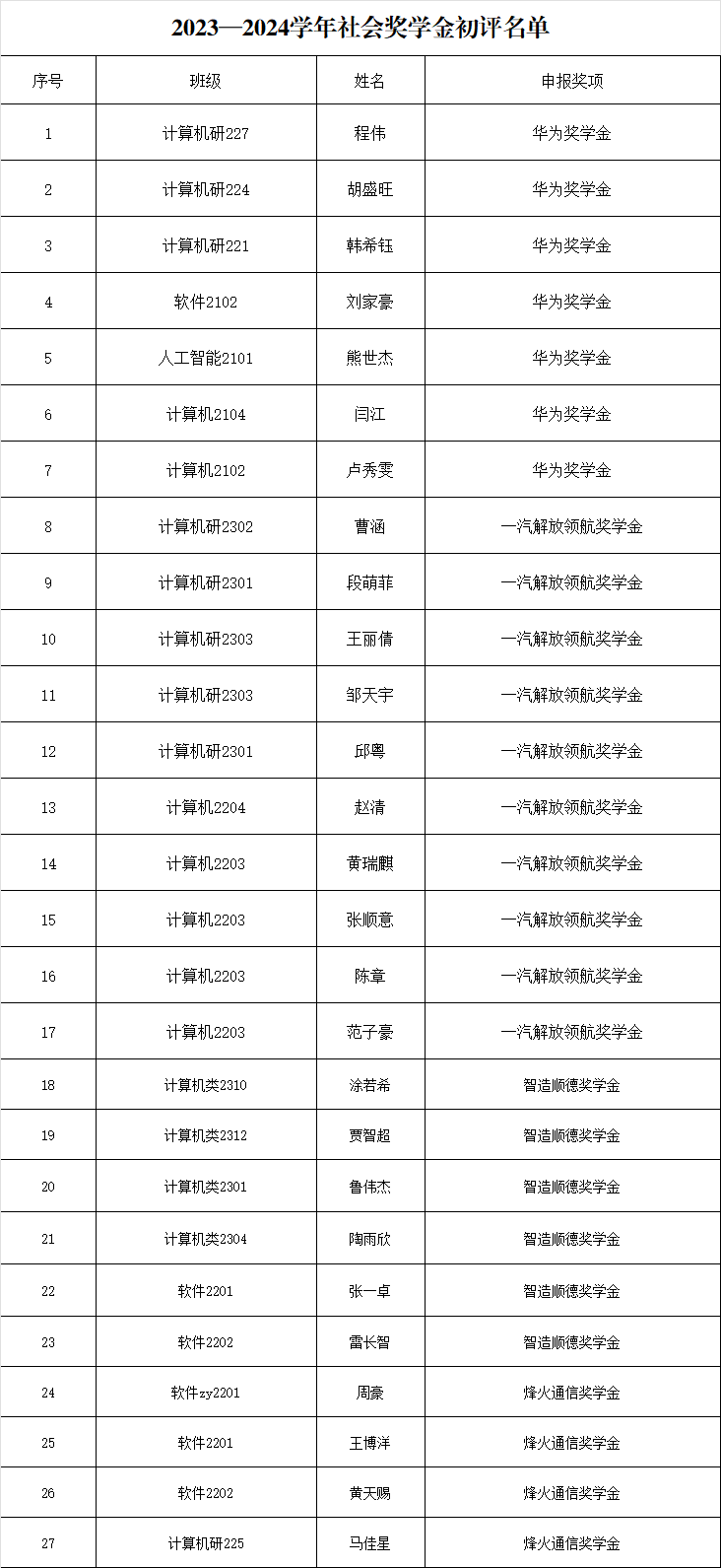 附:计算机与人工智能学院2023-2024学年社会奖学金获奖学生初评名单