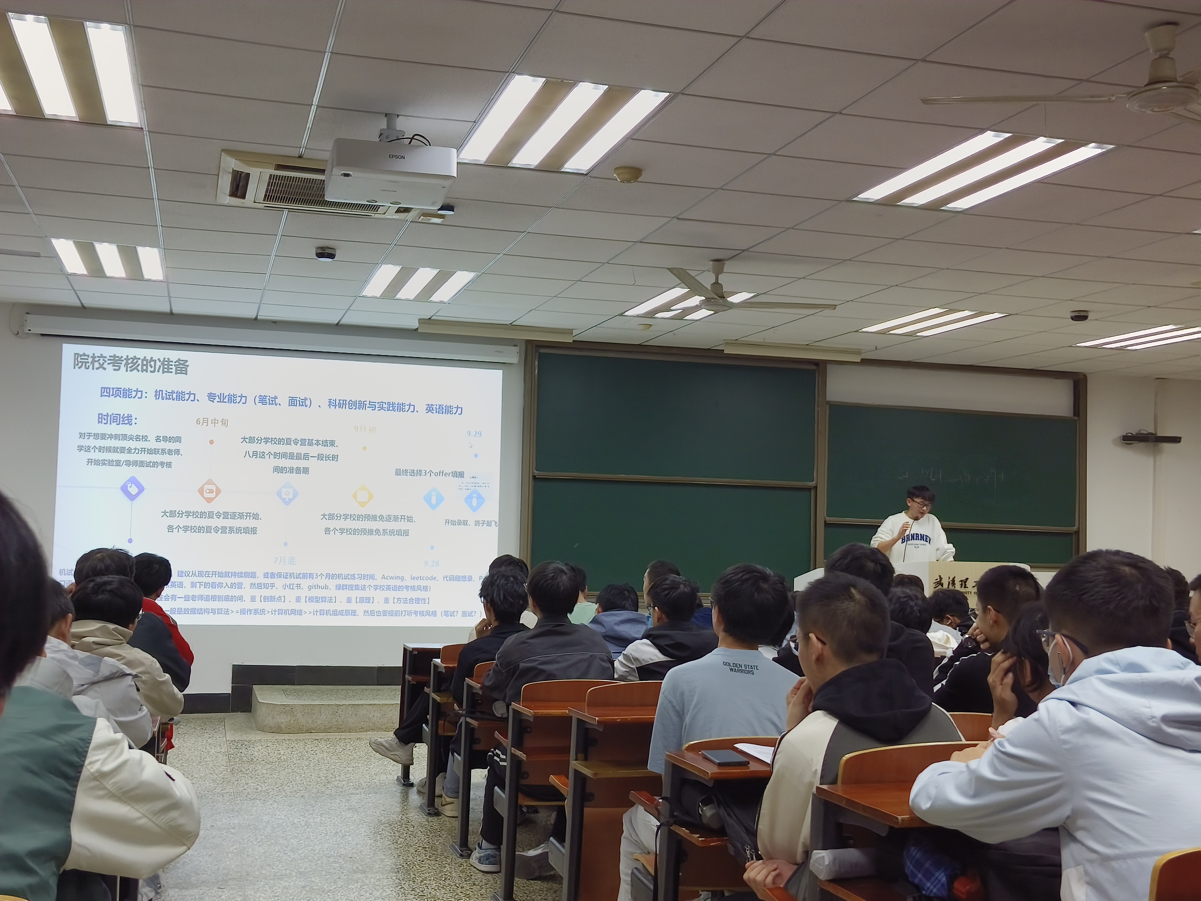 接下来,付天宇从英语口试、院校考核准备等方面分享了自己的经验。首先,他介绍了一些院校以及实验室的面试情况以及规则,提醒同学们提前联系导师以及与老师研究方向契合的重要性。其次,他详细介绍了英语口语面试的准备,推荐同学们不仅要准备个人介绍,还要着重准备自己所取得的科研成果的英语介绍,有利于随机应变。最后,他告诉同学们,个人的专业能力是重中之重,要提前准备编程练习以及专业知识的巩固。
